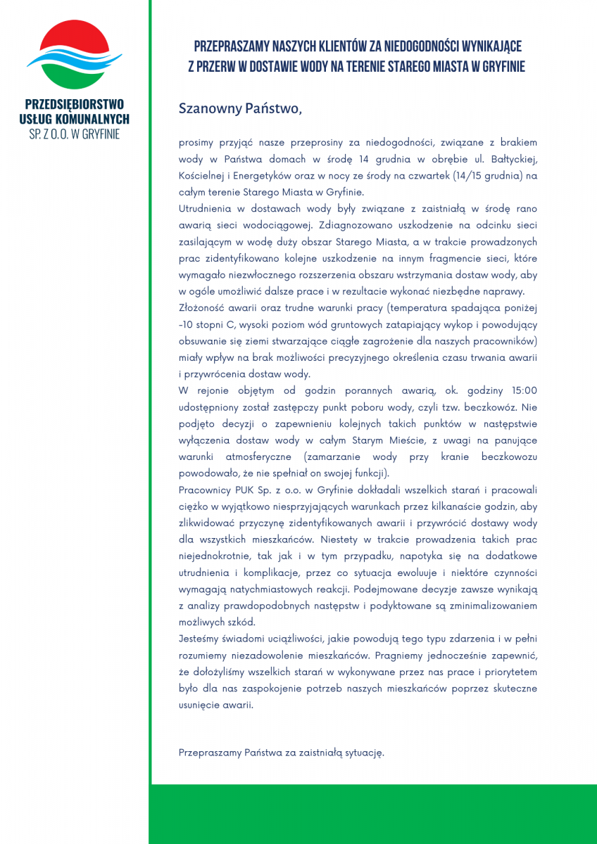 Przepraszamy naszych Klientów za niedogodności wynikające z awarii sieci wodociągowej w środę 14 grudnia