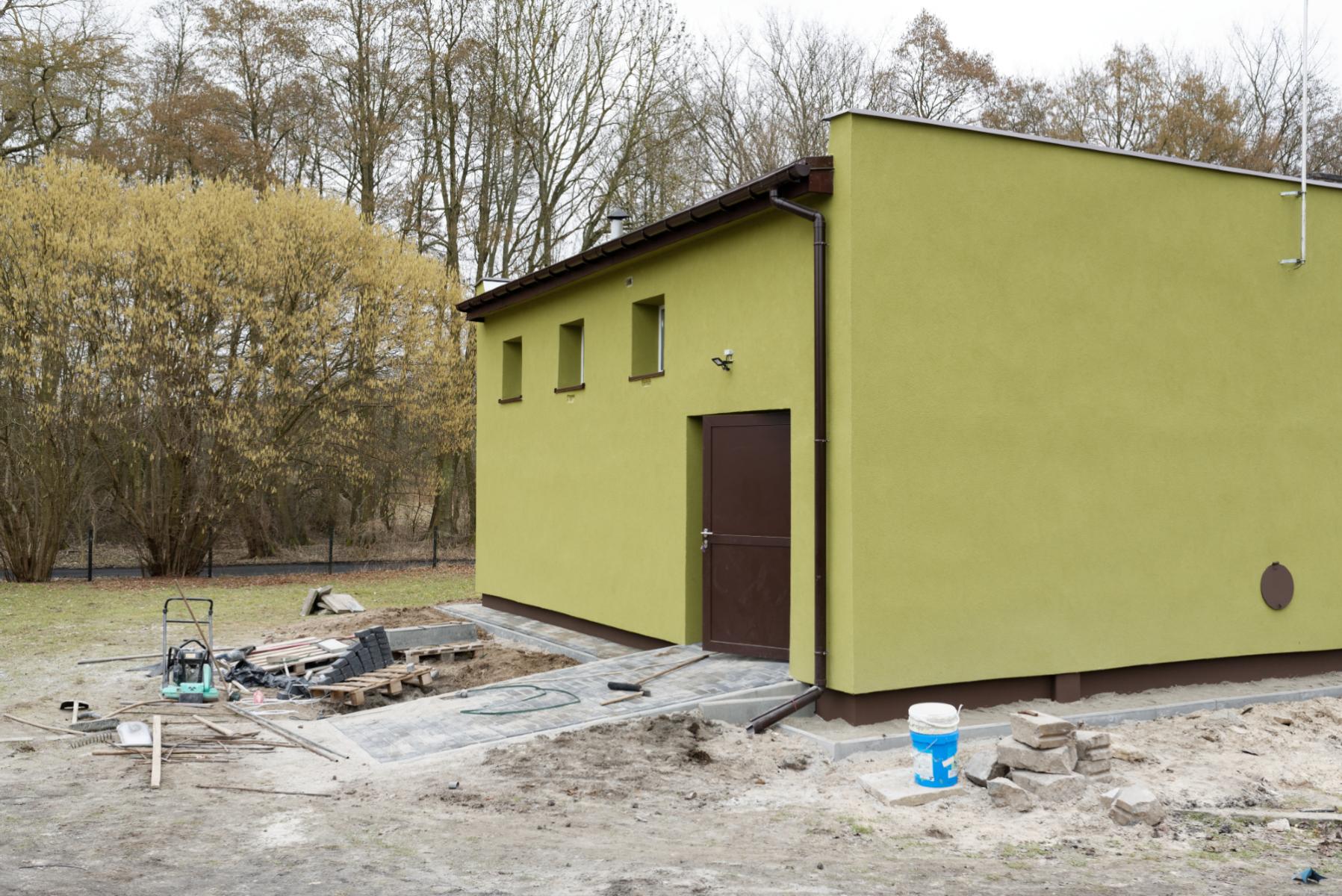 Pracownicy Przedsiębiorstwa Usług Komunalnych Sp. z o.o. w Gryfinie przeprowadzają obecnie kompleksowy remont części zewnętrznej budynków Stacji Uzdatniania Wody - Dębce. Prace obejmują m. in. wymianę pokrycia dachu wraz z opierzeniami oraz orynnowaniem, a także wykonanie elewacji.