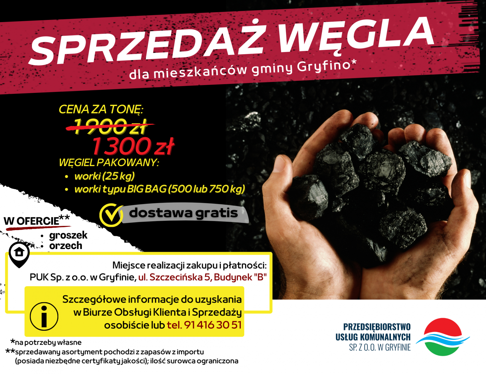 Przedsiębiorstwo Usług Komunalnych Sp. z o.o. w Gryfinie informuje, że nadal prowadzi sprzedaż węgla dla mieszkańców gminy Gryfino na potrzeby własne. Niezbędne informacje dostępne są w zakładce "Sprzedaż węgla".