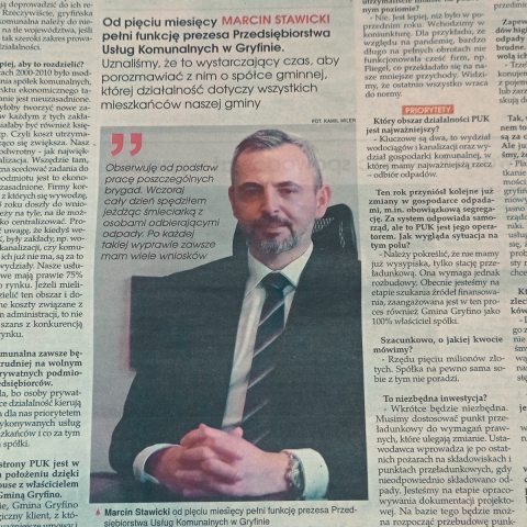 Po pięciu miesiącach pełnienia funkcji Prezesa Zarządu Przedsiębiorstwa Usług Komunalnych Sp. z o.o. w Gryfinie, Marcin Stawicki podzielił się swoimi dotychczasowymi wrażeniami, spostrzeżeniami i doświadczeniami w wywiadzie dla lokalnej gazety. Prezes Zarządu Spółki opowiedział także o wprowadzanych zmianach, usprawnieniach, wyzwaniach i priorytetach.