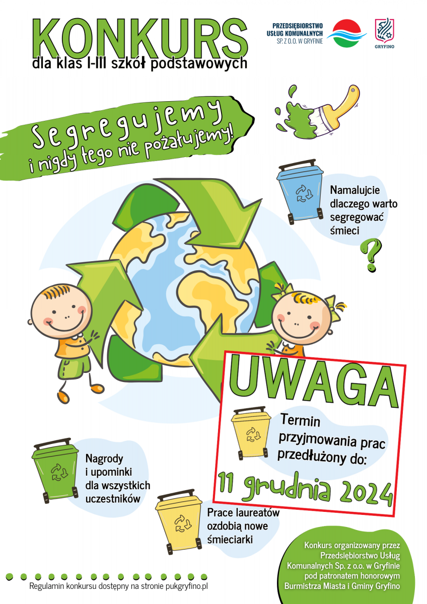 Przedsiębiorstwo Usług Komunalnych Sp. z o.o. w Gryfinie informuje, że został przedłużony termin przyjmowania prac w konkursie "Segregujemy i nigdy tego nie pożałujemy!". Zachęcamy do udziału i przypominamy, że te najlepiej ocenione rysunki zostaną odwzorowane na naszych specjalistycznych pojazdach do odbioru odpadów. Upominki przewidziano dla wszystkich uczestników.
