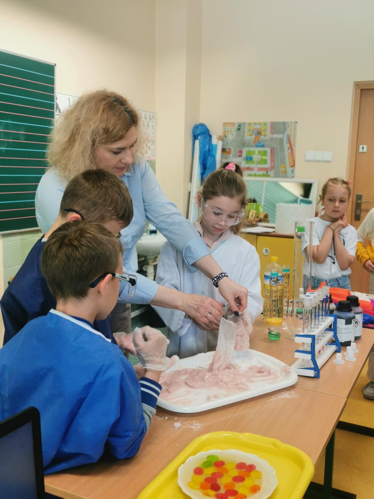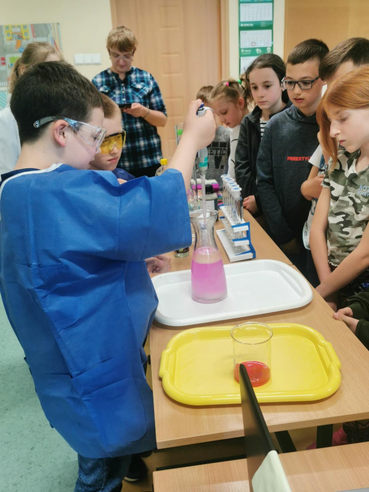 Dzieci wraz z Wychowawczynią p. Elizą Gad bardzo czynnie brały udział w warsztatach i chętnie odpowiadały na pytania pani Kierownik Laboratorium.